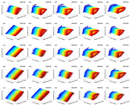 From Figure 13c, one can see that for amplitudes of 45, 60, and 75 m, the dissipated energy per cycle experiences an abrupt drop at around 3000 cycles. This corresponds exactly to the point where the hysteresis loop transitions from a parallelogram shape to an alternating triangle or line shape. This indicates that the interface slip state underwent a sudden change during this cycle interval. For instance, in the M45N50 condition, after a brief period of fluctuation, the system gradually enters a stable gross slip state as the number of cycles increases. This suggests that under high load–high amplitude combinations, interface hardening and damage accumulation accelerate the establishment of gross slip conditions, and the system eventually converges to a stable shear-dominated removal mode.