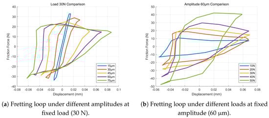 Because the trends of loop evolution under different load–amplitude combinations are highly consistent and a single loop is representative of the contact behavior, only two sets of results are selected here for analysis. Figure 11a shows the hysteresis loops at 60 m amplitude under varying load (10 N, 30 N, 50 N), and Figure 11b shows the loops at 30 N load under varying amplitude (15 m, 45 m, 75 m), to illustrate the evolution of slip behavior at the contact interface. In the 60 m amplitude condition (Figure 11a), as the normal load increases from 10 N to 50 N, the hysteresis loop shape changes significantly. At 10 N, the loop is narrow and nearly triangular: the loading branch is steep and linear, and the unloading branch drops almost straight down, giving an elongated shape. This suggests that friction force builds up almost instantaneously during loading and vanishes rapidly upon unloading. At 30 N, the top of the loop becomes flatter and the overall shape transitions toward a parallelogram, with increased loop width. This indicates that the friction force builds up more gradually, and the changes in force during loading and unloading become more balanced. By 50 N, the loop broadens further, approaching an obtuse parallelogram shape with nearly equal slopes for loading and unloading, suggesting that the contact stiffness and frictional response have stabilized and the friction force evolution is now characterized by gentle rise and gentle fall.