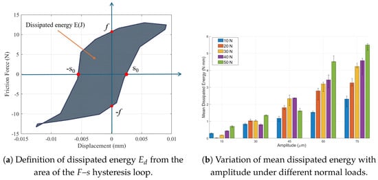 Figure 12a illustrates the determination of from a representative F–s loop. By applying this method to the experimental data, the cycle-dependent dissipated energy under various loading conditions was obtained. As shown in Figure 12b, increases nonlinearly with displacement amplitude, highlighting the dominant role of amplitude in controlling slip distance and interfacial energy input. In contrast, the effect of the normal load is primarily regulatory: higher enhances the contact stress and frictional resistance, leading to a moderate increase in .