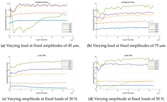 From Figure 13a,b, under fixed amplitude with varying load, the number of cycles required to reach a stable dissipated energy level is clearly extended with higher loads. In other words, under higher load conditions, the system requires a longer time to achieve steady-state energy dissipation. Specifically, in Figure 13b, the cycles needed to reach stability are about 200, 250, 4900, 6500, and 7200 for the successive load conditions. Moreover, the steady-state value of the dissipated energy per cycle increases with increasing load, indicating that higher loads enhance interfacial shear stress and prolong the transition period from partial slip to gross slip, thereby impeding the rapid establishment of the material removal process.