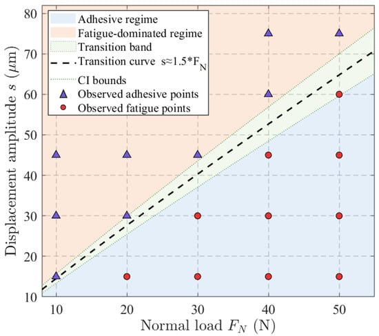 It is worth noting that the ratio of load to amplitude (approximately 1:1.5) not only determines the threshold for gross slip initiation but also affects the development of a stable interfacial state. As illustrated in Figure 14, this ratio defines the transition boundary between adhesive and fatigue-dominated regimes: data points located below the curve remain in the adhesive region, whereas those above it converge to a fatigue-dominated state. The transition band surrounding the boundary further highlights the gradual nature of this shift, indicating that the 1:1.5 ratio provides a quantitative criterion for predicting interfacial stability under different displacement–load combinations.