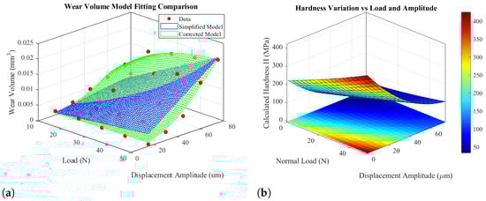 In this work, a physics-inspired “equivalent hardness-corrected Archard model” is proposed, in which a hardness function is introduced to capture the nonlinear influence of load and amplitude. The hardness is assumed to follow a second-order polynomial form with respect to the normal load () and amplitude (s):