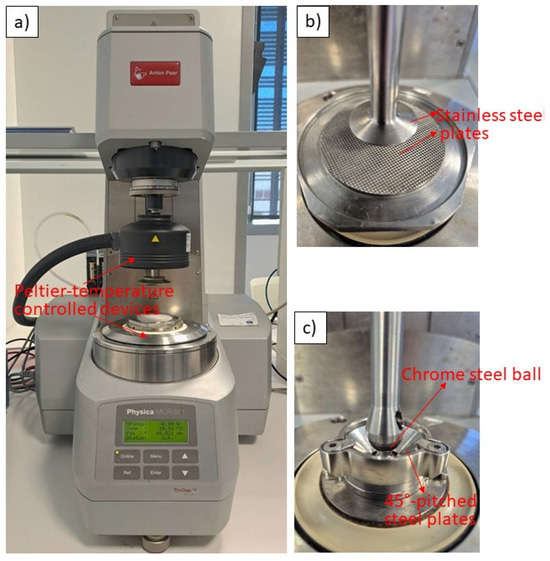 In the context of tribological characterization, both the coefficient of friction (COF) and wear scar diameter were analyzed. A ball-on-three-plates tribology cell (Figure 1c) was employed, coupled to a Physica MCR 501 controlled stress rheometer (Figure 1a) from Anton Paar (Graz, Austria). The tribology cell consisted of a lower section featuring three 45–pitched steel plates (C45E-1.1191) with a hardness rating of 25–30 HRC. The upper section was designed to hold a fixed bearing ball made of chrome steel (100Cr6) with a diameter of 12.7 mm [17]. The plates and ball were securely fixed in their respective geometries to prevent any unwanted vibrations or rolling, thereby enabling the tests to be conducted under pure sliding. The coefficient of friction was calculated as the ratio of the measured friction force to the applied normal load on the three plates.