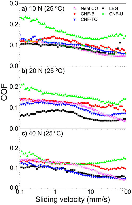 Stribeck-like curves for the three 1.4 wt.% CNF-based biogreases studied, at 25 °C, at selected contact loads: (a) 10 N; (b) 20 N; (c) 40 N. Neat castor oil (CO) and LBG (reference lithium-based grease) are included for comparison purposes.