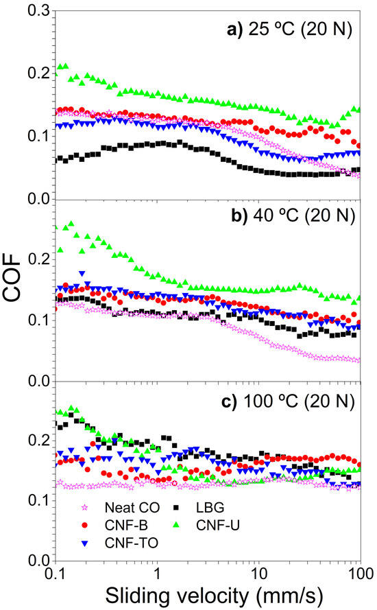 Stribeck-like curves for the three 1.4 wt. % CNF-based biogreases studied, at 20 N, at selected temperatures: (a) 25 °C; (b) 40 °C; (c) 100 °C. Neat castor oil (CO) and LBG (reference lithium-based grease) are included for comparison purposes.