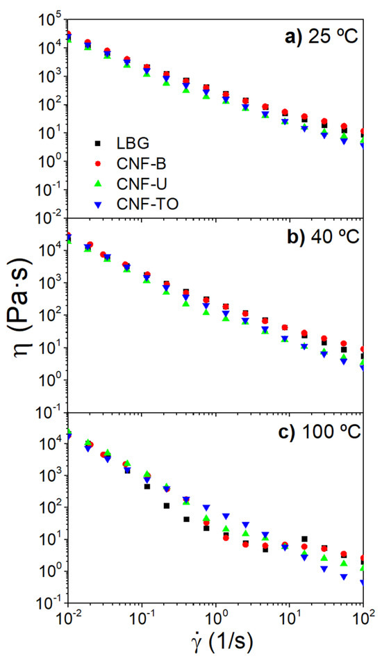 Viscous flow curves for the three CNF-based biogreases at: (a) 25 °C; (b) 40 °C; (c) 100 °C. LBG (reference lithium-based grease) is included for comparison purposes.