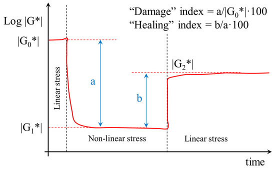 Schematic of the time evolution of the dynamic shear modulus, |G *|, at constant temperature and frequency. Definitions of “damage” and “healing” indexes are included.