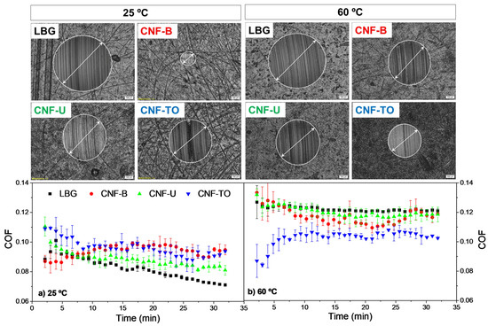 The analysis of the time-dependent evolution of the coefficient of friction (COF), along with the resulting wear scars, provided a more comprehensive tribological characterization of the CNF-based biogreases. Wear tests were conducted at both 25 and 60 °C under a normal load of 20 N and a rotational speed of 40 rpm, corresponding to a sliding velocity of 18.8 mm/s. These conditions fall within the mixed lubrication regime, where friction behavior is influenced not only by the nature of the contacting surfaces but also by lubricant viscosity, applied load, and sliding velocity [24,30]. As such, the selected parameters allowed for a realistic evaluation of the biogreases’ performance under practical operating conditions, offering valuable insights into their lubrication effectiveness across different temperatures.