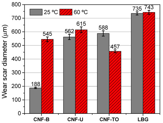 The effect of temperature was also examined. As shown in Figure 6b, higher coefficients of friction were recorded at 60 °C, accompanied by larger wear scar diameters (Figure 7). In general, both friction and wear increased with temperature, likely due to the reduction in base oil viscosity [35]. Once again, the reference LBG produced the largest wear scars, with minimal variation between 25 °C and 60 °C (735 µm and 743 µm, respectively), despite a significant increase in its friction curve at elevated temperature. The similar friction behavior observed for CNF-B and CNF-U at 60 °C resulted in comparable wear scar diameters—545 µm and 615 µm, respectively. Remarkably, CNF-TO exhibited a friction profile at 60 °C that closely resembled the behavior of CNF-B at 25 °C. Consequently, CNF-TO showed an unexpected 22% reduction in wear scar diameter, from 588 µm at 25 °C to 457 µm at 60 °C. In fact, CNF-TO yielded the smallest wear scar diameter at 60 °C among all tested greases. In summary, the wear-reducing effectiveness of CNF-based biogreases is most evident when cellulose fibrils accumulate around the tribopair surfaces during the “running-in” phase, as demonstrated by CNF-B at 25 °C and CNF-TO at 60 °C.