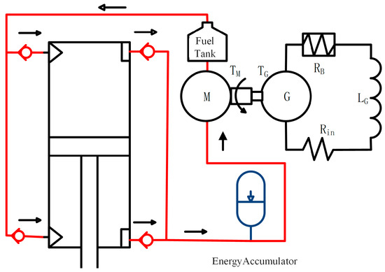 Hydraulic input power to the motor is evaluated from the effective pressure difference across the motor and the volumetric flow. Mechanical losses due to viscous drag, Coulomb friction, and volumetric leakage are represented via a mechanical efficiency to obtain shaft power. The shaft drives a permanent magnet DC generator; the generated voltage is proportional to rotational speed through the back electromotive force (EMF) constant, and the output current is determined by the generator internal resistance together with the connected load or DC link. The equation is provided below: