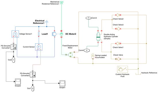 The simulation is implemented in MATLAB Simulink. As shown in Figure 2, the block diagram comprises a hydraulic cylinder, a gas charged accumulator, a hydraulic motor, a permanent magnet DC generator, and a configurable load interface, interconnected through pipelines and a check valve rectification circuit. The assembly replaces a conventional suspension damper and introduces an energy conversion branch while preserving the primary force path. The principal parameters and rating data used for the component models are summarised in Table 1.