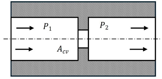 The check valve in the rectification circuit enforces unidirectional flow and introduces a characteristic pressure drop. Its behaviour is represented using a standard thin-orifice model (Figure 3) with an effective flow area and discharge coefficient, and the valve opens once the differential pressure exceeds the cracking threshold. Reverse flow is blocked except for a small leakage branch that accounts for clearances. The resulting pressure–flow relation follows the conventional orifice equation, and hysteresis between opening and reseating is included to reflect realistic valve dynamics.