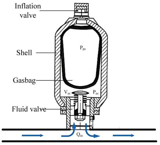 where represents the volume of the accumulator, is the pre-charging pressure, is the gas specific heat ratio of the inflated accumulator, are used to describe the system. They relate according to the following expression: