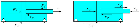 where is the force on the piston generated by the pressure in the cap end (rodless) chamber, and is the force generated by the pressure in the rod end chamber. denotes the external excitation applied to the piston rod. is the friction between the piston rod and the cylinder body during both extension and retraction, and is the friction between the piston head and the cylinder bore. All friction components act opposite to the instantaneous piston displacement (or velocity) direction.