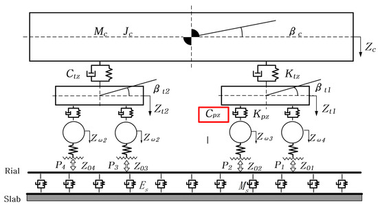 When the primary vertical dampers of a high-speed train are replaced by HERD, the vehicle equations of motion must extend the conventional mass–spring–damper formulation to include the internal dynamics of the harvesting units. The derivation proceeds from a force balance of the primary suspension at the axlebox–bogie interface, establishes consistent sign conventions for all relevant degrees of freedom, and then assembles the coupled carbody–bogie–wheelset model with the HERD represented by a state-dependent dissipative force linked to its hydraulic and electrical operating conditions.