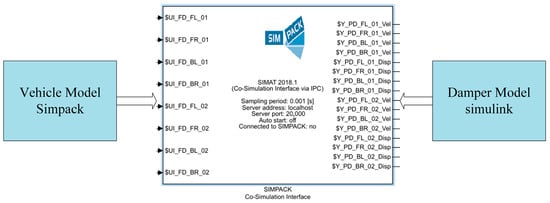 Signal exchange between the solvers follows a standard co-simulation interface. At each synchronisation step, SIMPACK supplies the relative displacement and velocity at the damper attachment points, while the Simulink subsystem returns the corresponding damper force evaluated from the hydraulic and electrical states, together with diagnostic variables for energy accounting. Time integration uses a common communication step selected to resolve the fastest dynamics of the hydraulic circuit; SIMPACK employs its native integrator for the multibody system, and Simulink advances the damper states over the same interval with error control. Initial conditions are obtained from static equilibrium, including accumulator pre-charge and steady operating pressures, to ensure consistent start-up.