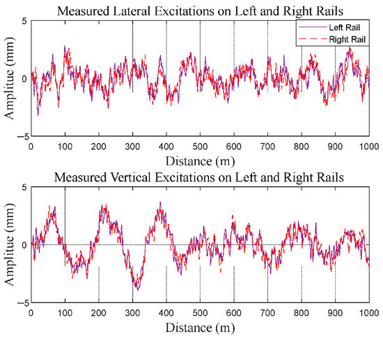 Track irregularity is the primary excitation for the damper. Variations in the excitation spectrum materially influence vibration attenuation and power regeneration. In the model, vertical and lateral irregularities are applied as base motions at the damper attachment points. A stationary random input is generated to match the measured power spectral density of the Wuhan Guangzhou high-speed line (Figure 8), with spatial spectra mapped to the time domain through the operating speed. The synthesis preserves amplitude, wavelength content, and phase statistics over the relevant bands, and the same realisation is used for comparative cases to ensure consistent evaluation of damping and power generation performance.