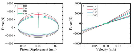Effect of load resistance on HERD characteristics: (a) Force–displacement loops; (b) Force-Velocity curves.
