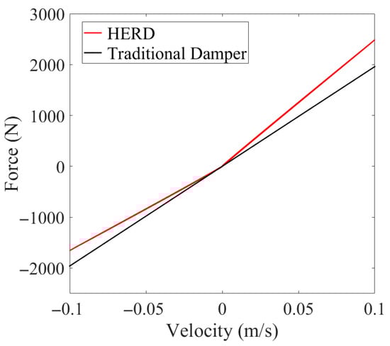 Comparative force–velocity curves of the HERD and a conventional damper.