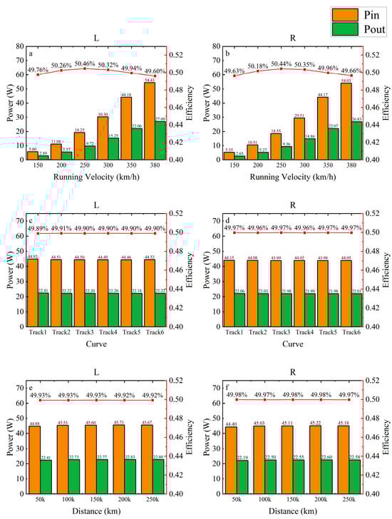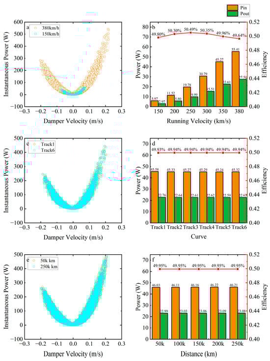 A physics-based vehicle–track coupled dynamics model configured with a hydraulic electromechanical regenerative damper (HERD) was developed to quantify power regeneration and wear depth under service-representative inputs. In the simulation experiment, the electrical load was 25 ohms, across 150 to 380 km/h, recovery efficiency remained about 49–50 percent with weak sensitivity to curve radius. At different radii ranging from 3 to 12 km and at different distances ranging from 50,000 to 250,000 km, the recovery power was more similar, at 49.93–49.94% and 49.95%, respectively. It showed relatively weak sensitivity to the changes in curve radius and distance. Instantaneous regenerative power exceeded 425 W at high excitation. The wear depth model previously validated against field measurement was used without retuning and reproduced measured magnitudes and trends in wear degradation rate, showing 3.51 × 10−6 mm/km at 100,000 km and 3.08 × 10−6 mm/km at 200,000 km, close to measured 3.11 × 10−6 and 2.91 × 10−6 mm/km.