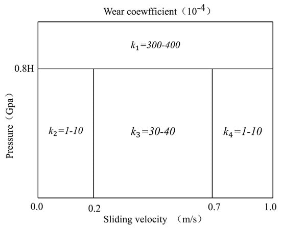 The wear predictions in this study are based on the Archard formulation with a pressure–velocity dependent coefficient map. While this approach is widely adopted, the results are inherently sensitive to tribological parameters such as the wear coefficient, material hardness, and environmental conditions. The dimensionless wear coefficient reported for pearlitic wheel steels spans approximately 10−5–10−3 depending on lubrication state, surface contamination, and environmental humidity. Since wear depth scales linearly with , this variability could alter the absolute predictions by one to two orders of magnitude. The hardness of wheel steel typically ranges between 200 and 400 HV, and Archard’s law implies an inverse relationship between hardness and wear rate; a 20% increase in hardness from work hardening would directly reduce wear depth by a similar fraction, while thermal softening would have the opposite effect. Environmental factors further modify the effective wear rate: water or oil contamination lowers the friction coefficient and may shift operating points into lower-wear regions of the coefficient map, whereas sand or metallic debris can increase abrasive action and elevate the effective .