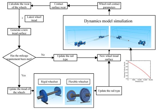 In terms of wear depth, Sang [23,24] conducted a systematic investigation of wheelset wear during braking and acceleration in high-speed service, showing peak wear rates under emergency braking and low-adhesion conditions and underscoring the influence of traction control and lateral dampers. Song [25] formulated and validated a braking-condition wheel–rail wear prediction model, elucidating the roles of braking torque, friction coefficient, and operating speed, and examined how wear evolution feeds back into vehicle dynamic responses. Liu [26] evaluated rolling-contact wear prediction accuracy while treating the wear coefficient as an uncertain parameter and compared alternative contact-mechanic formulations and coefficient identification strategies. Zhu [27] quantified the effect of train passing at different speeds, confirming that substantial wear increases with speed and more severe damage on leading vehicles and front-axle wheels. Luo [28] developed a high-speed wheel-wear model incorporating stochastic variability in track geometry and friction; by coupling the Archard law with FASTSIM, the approach reproduced wear distribution and dynamic evolution over 300,000 km of operation. Wang [29] contrasted two-car and single-car configurations to isolate the effects of inter-car connection units on normal force, lateral force, and wear, finding greater wear on wheels adjacent to the connection units under an Archard-based assessment. Andrzej [30] proposed an energy-dissipation-based wear prediction method consistent with the Archard wear model, verifying proportionality between frictional dissipation power and wear depth and showing that plastic deformation diminishes peak contact stress while extending the wear-affected region. Apezetxea [31] proposed a high-speed wear model using quasi-static simulation with characteristic-point simplification, achieving favourable computational efficiency and predictive accuracy when compared with measurements from two metro lines. Hao [32] analysed wear evolution in C80 heavy-haul freight cars using UM multibody dynamics coupled with an Archard model, validating predictions against measured data and providing guidance for early lubrication and periodic maintenance planning. Wheel defects such as polygonal wear and flats markedly elevate vertical wheel–rail forces and vibration acceleration; higher speed, larger polygonal order, and longer flat length intensify vehicle vibration and accelerate wear depth, which in turn exacerbates defect growth, establishing a detrimental feedback loop [33,34,35,36].