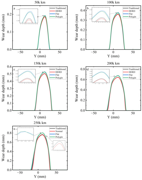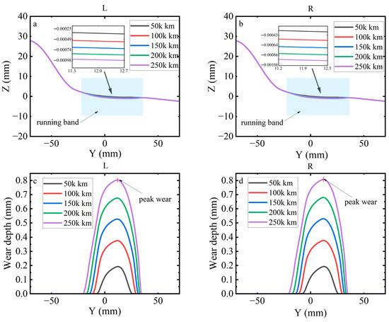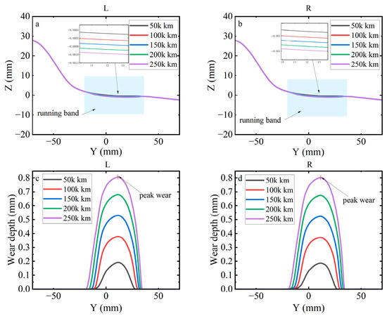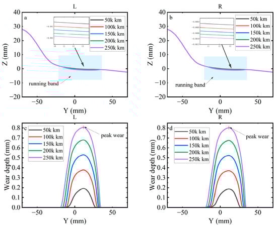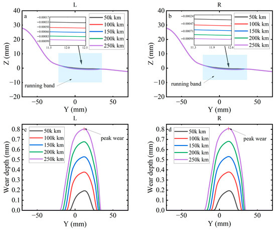 Figure 21 compares the left and right wheel profiles and the corresponding wear depth at 50,000 km intervals over a total distance of 250,000 km under deceleration. Figure 21a,b show progressive material removal on the tread with the recession centred near the rolling circle; the profile evolution is smooth and the left–right curves remain closely aligned, indicating no evident lateral migration of the dominant wear zone. As seen in Figure 21c,d show single-peak wear distributions whose peak magnitude increases monotonically with mileage. The lateral extent of the wear region also expands with distance, while the overall shape of the distribution is preserved. The wheel profiles and wear depth indicate cumulative wear concentrated around the wheel tread with a stable, nearly symmetric evolution between the left and right wheels.