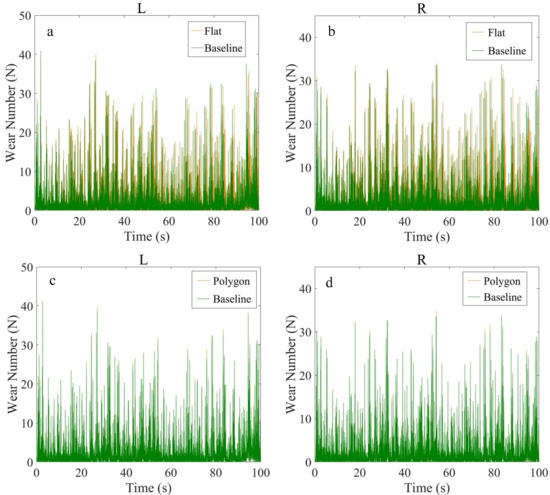 Wear number over a 100 s run at 350 km/h: (a) nominal left wheel versus scarred left wheel; (b) nominal right wheel versus scarred right wheel; (c) nominal left wheel versus polygonal left wheel; (d) nominal right wheel versus polygonal right wheel.