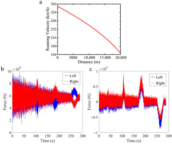 The dynamic performance during deceleration from 350 km/h to 150 km/h over 20 km: (a) Velocity-displacement curve; (b) Vertical wheel-rail force; (c) Longitudinal wheel-rail force.