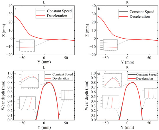 Wheel profile and wear depth under constant speed and deceleration: (a) left wheel profile; (b) right wheel profile; (c) left wheel wear depth; (d) right wheel wear depth.