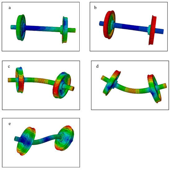 Modal shapes of the flexible wheelset for modes 0–4: (a) 0th mode, (b) 1st mode, (c) 2nd mode, (d) 3rd mode, and (e) 4th mode. Colour contours indicate the magnitude of deformation or stress distribution.