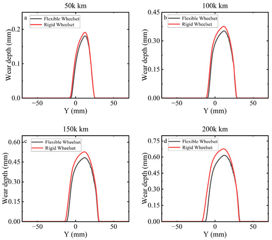 The wear depth every 50,000 km under different excitations for the flexible wheelset and rigid wheelset: (a) 50,000 km; (b) 100,000 km; (c) 150,000 km; (d) 200,000 km.