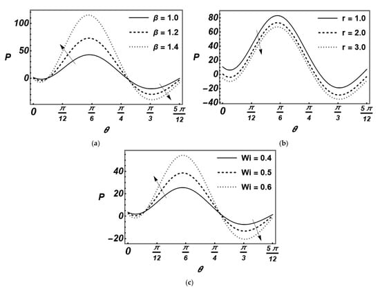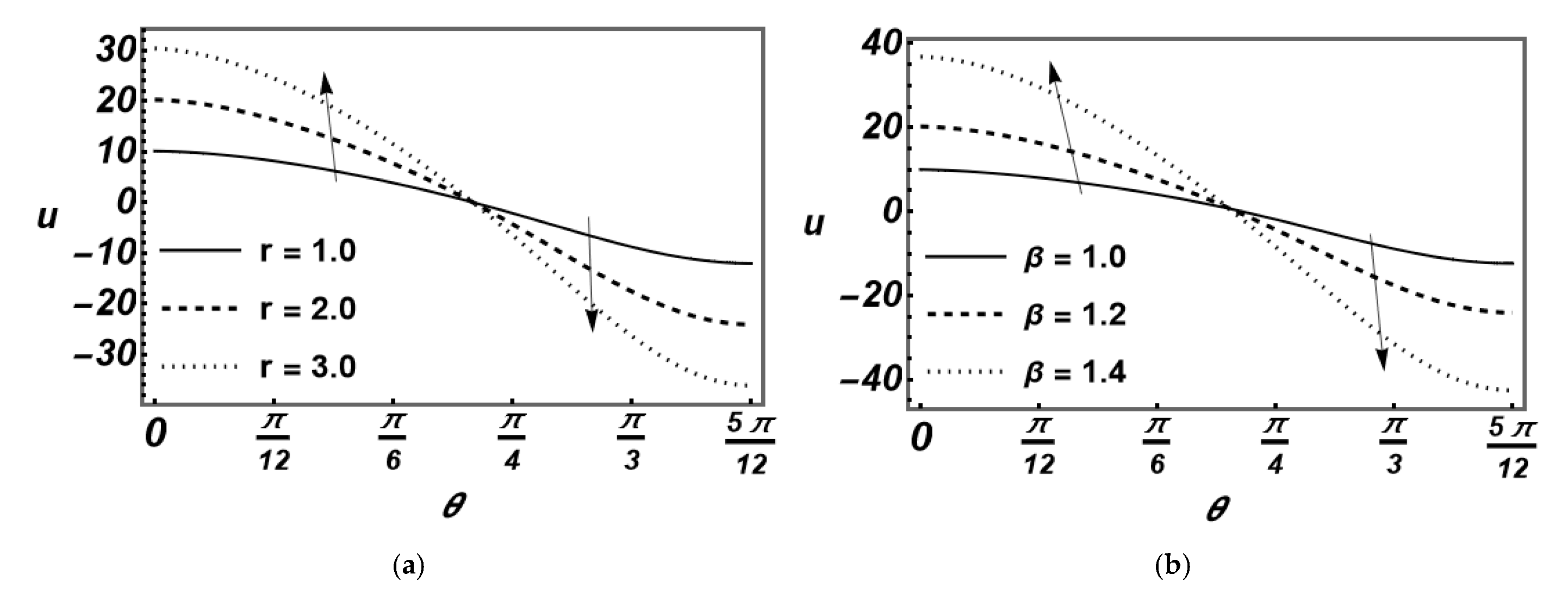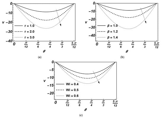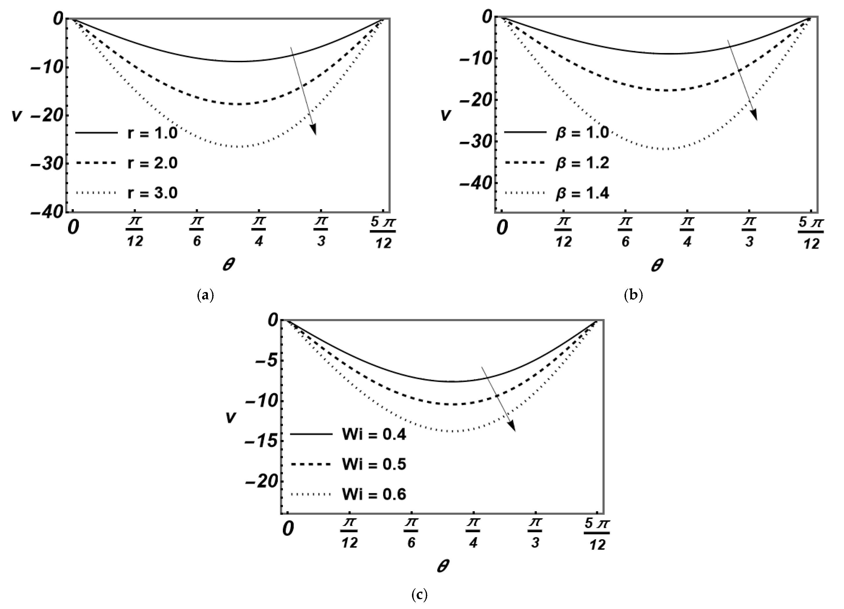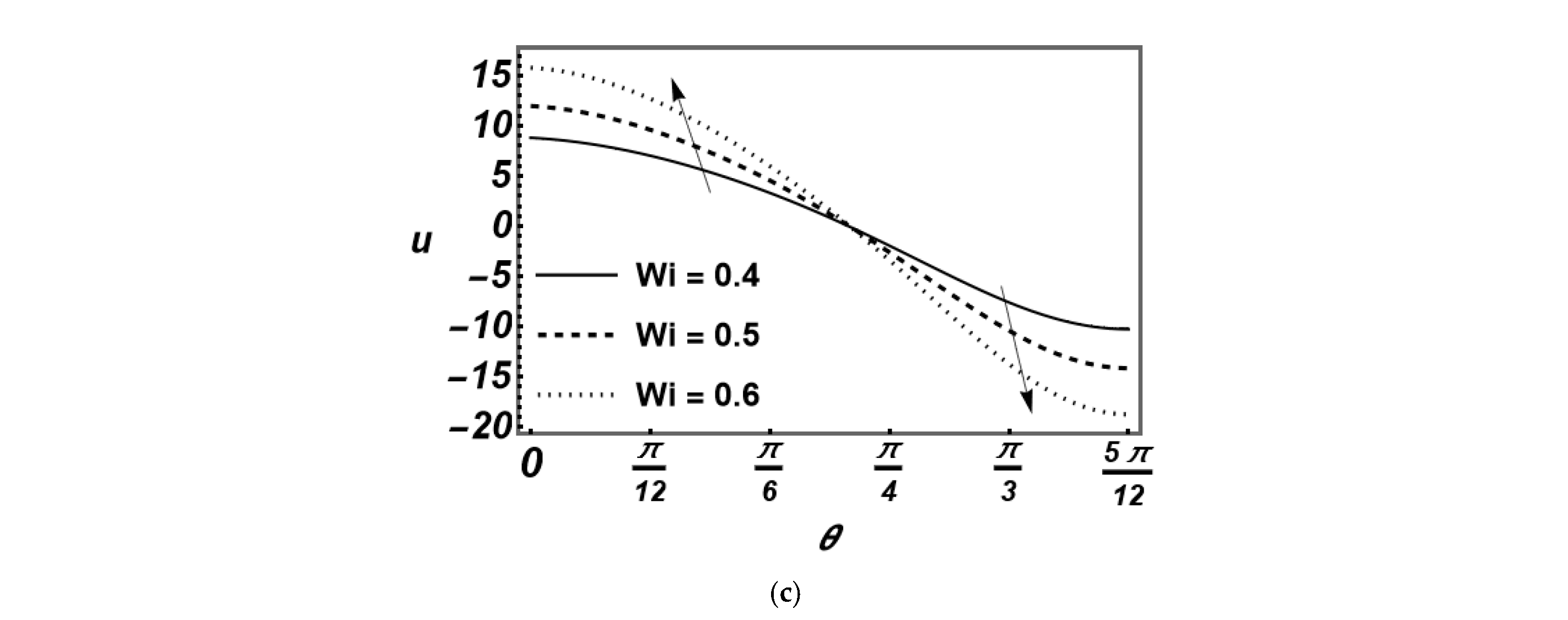 Figure 3 displays that coating in the rotational direction of the substrate following the parabolic path during the curtain coating process. The azimuthal velocity is accelerated by the substrate length, slip length parameter, and relaxation time in the reverse direction due to the movement of the substrate in a positive direction.