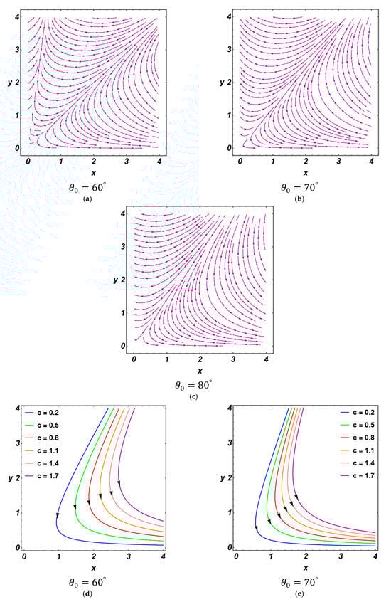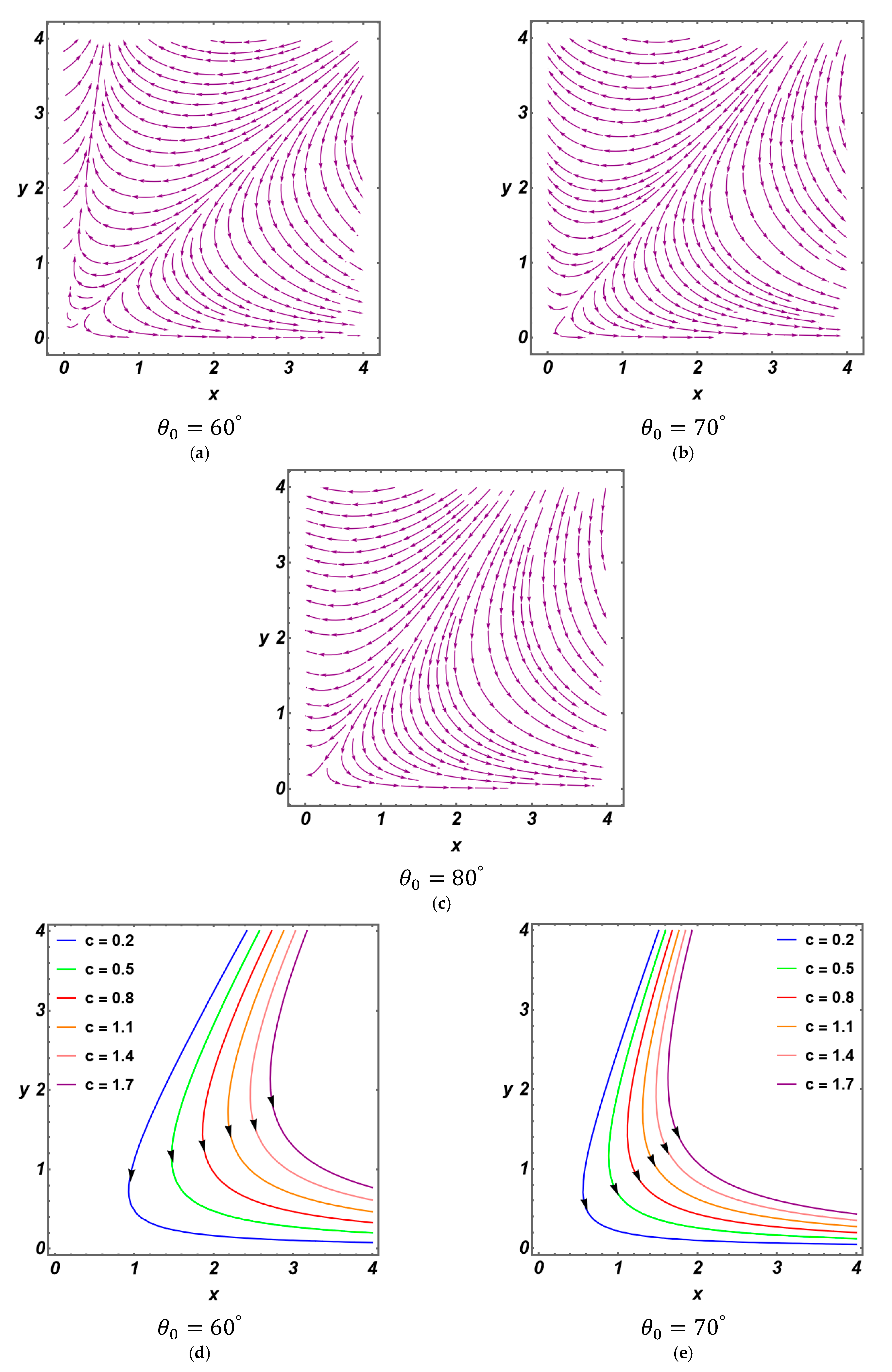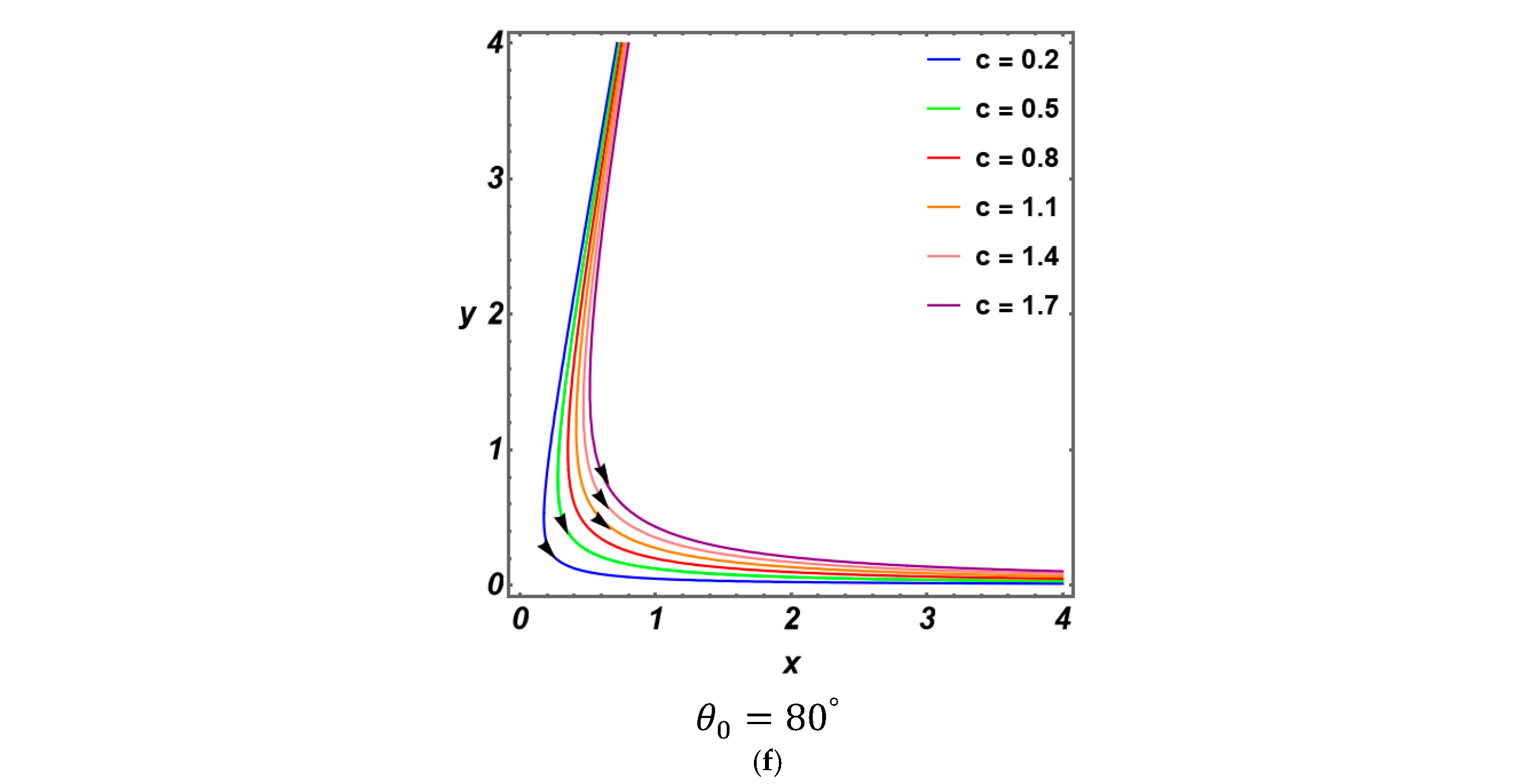 Figure 9 depicts the streamline patterns against the corresponding parameters related to the flow characteristics of a coating fluid. The introduction of a slip condition at the substrate allows limited tangential motion between the fluid and the substrate. The abrupt velocity discontinuity associated with the classical no-slip condition is eliminated. This relaxation of the boundary constraint prevents the buildup of excessive shear and effectively removes the singularity at the corner. As a result, the flow field becomes more physically realistic, exhibiting well-defined and regular streamline patterns that enhance coating uniformity and stability. Furthermore, as the curtain angle increases, this reduces local velocity gradients and stress buildup, promoting smoother streamline alignment and a more stable coating bead. This interaction defines the critical role of the slip condition and curtain angle in regularizing the flow dynamics at the corner.