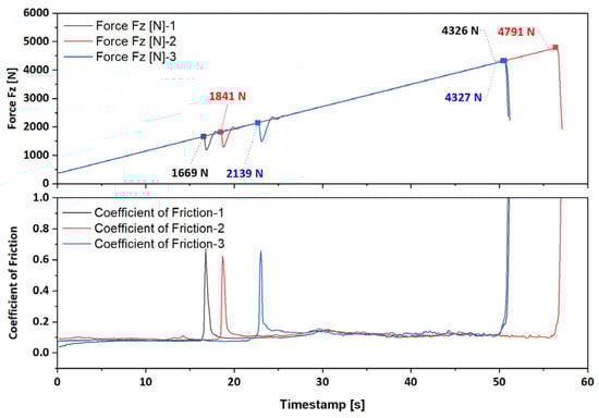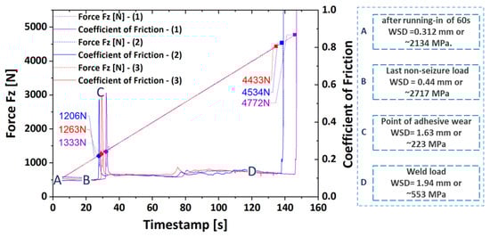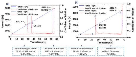 However, we have performed the same test with 60 s of running-in at 400 N. Figure 3b shows the evolution of the normal load and the coefficient of friction after completion of the running-in. It has been observed that the %RSD for the last non-seizure load and weld load is within 1%, which shows excellent repeatability of the results.