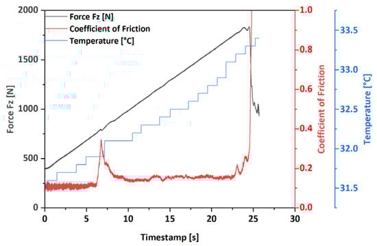 Figure 6. Evolution of temperature at a constant load ramp rate of 30 N/s with a running-in period of 60 s at normal load 400 N, RT and a rotational speed of 1770 rpm of e-axle fluid.