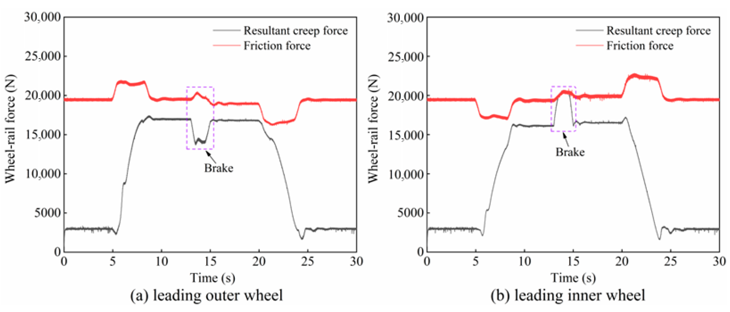- During braking on a large-radius curve, the creep force on the guiding inner wheel may reach saturation, causing relative sliding between the wheel and rail. This braking-induced sliding can excite friction-induced self-excited oscillations, thereby promoting corrugation formation on the inner rail.
