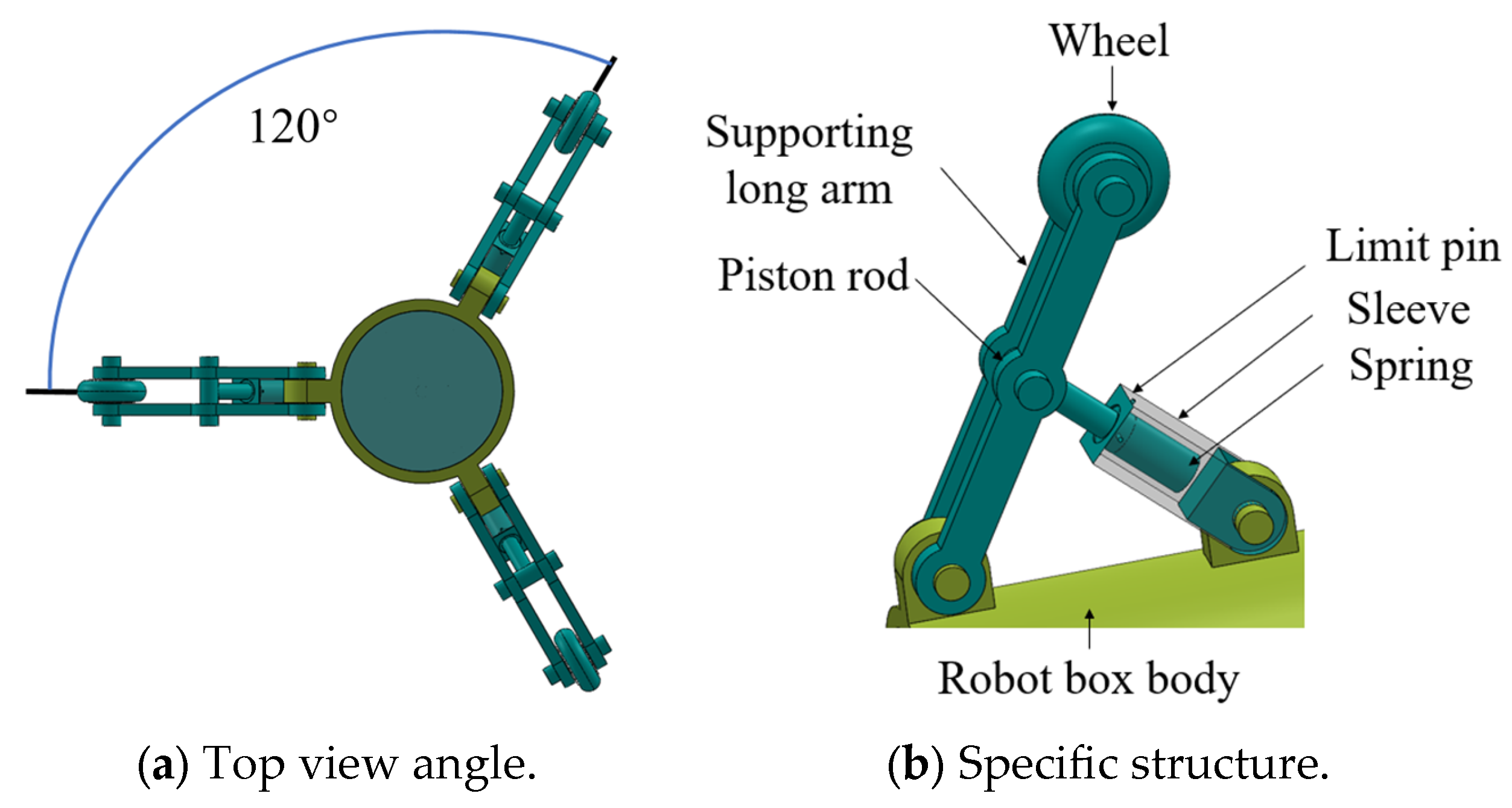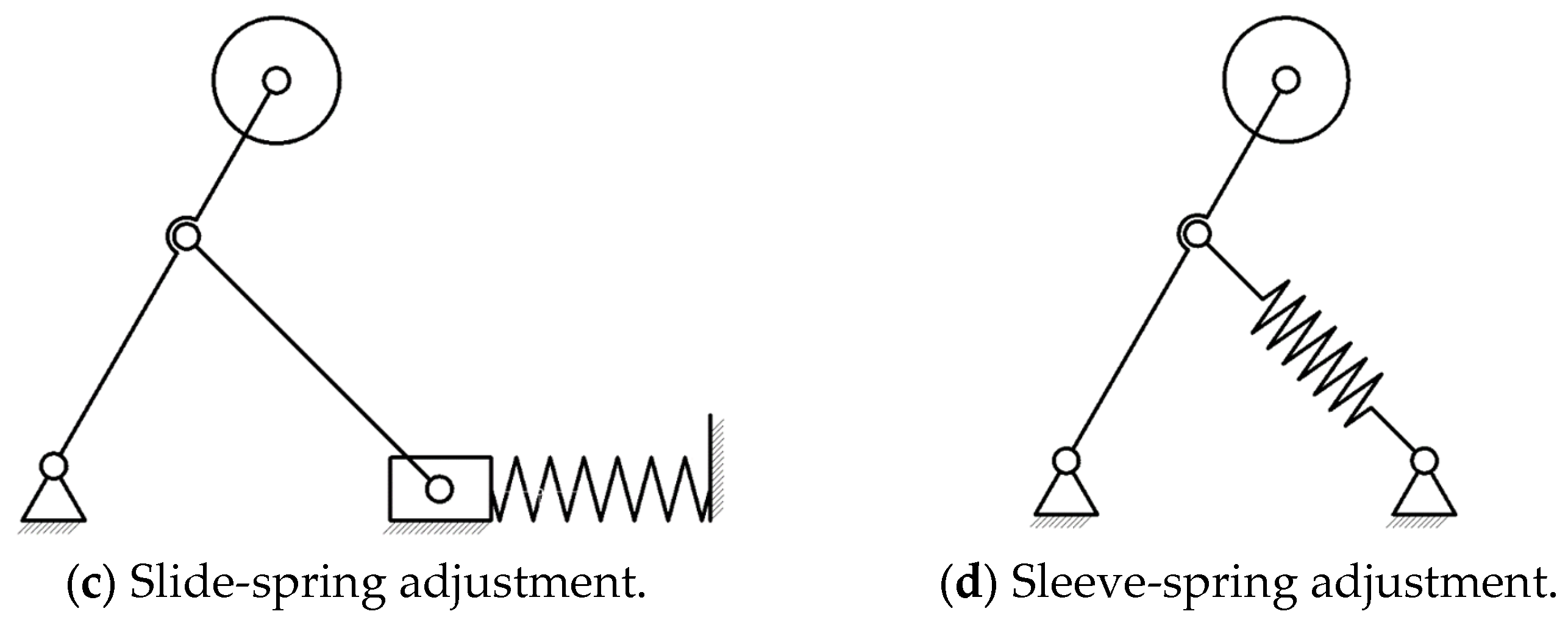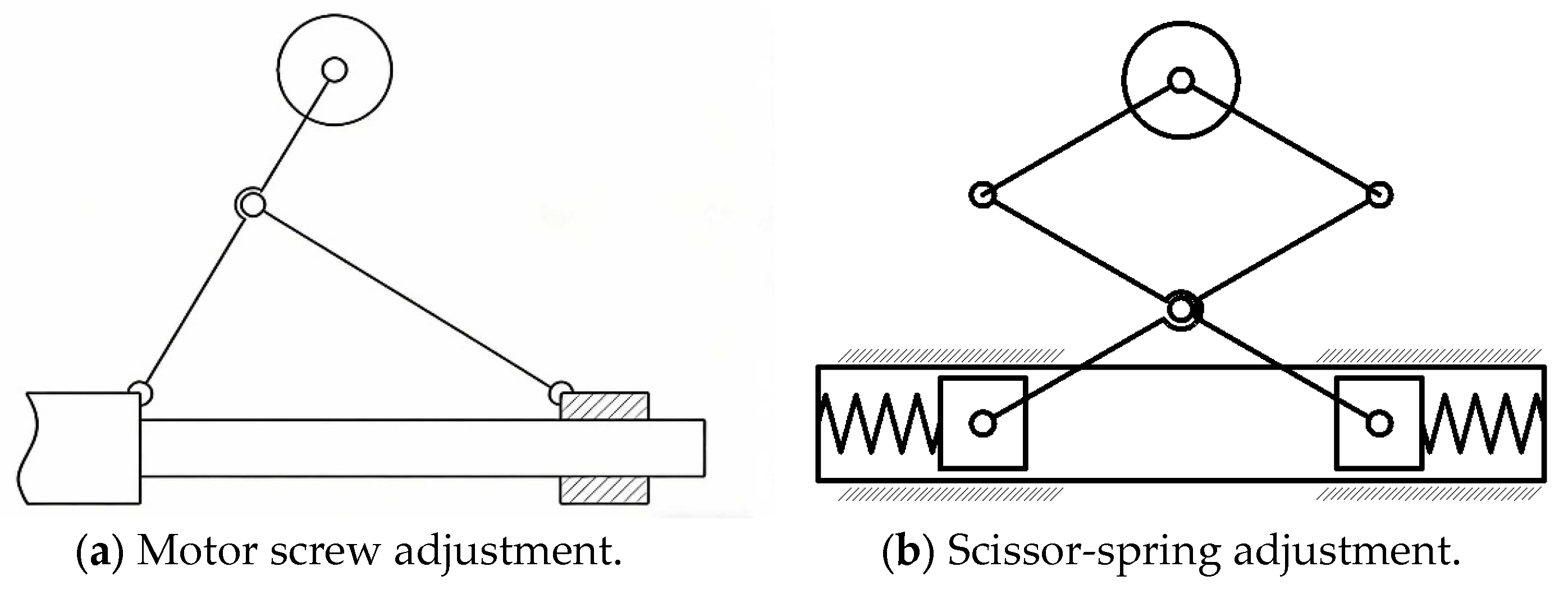 Common height adjustment methods for speed-measuring support devices include motor-lead screw adjustment, scissor-spring adjustment, slider-spring adjustment, and sleeve-spring adjustment (Figure 2). The motor-lead screw adjustment offers high support strength and a wide adjustment range but features a complex structure, requires power, and has high energy demands. The scissor-spring adjustment boasts high sensitivity yet has numerous rotating pairs in the scissor structure, resulting in low support strength. The slider-spring adjustment is sensitive and provides a certain level of support strength, but the slider mechanism requires guide rails and occupies a certain axial space. Compared with the previous three methods, the sleeve-spring adjustment combines the advantages of high sensitivity, simple structure, favorable support performance, and small space occupation. For these reasons, the sleeve-spring adjustment method is selected for the design of the speed measurement support device. As illustrated in Figure 3a,b, the speed measurement support mechanism employs a sleeve-spring adjustment method. In this configuration, a long support rod compresses the spring within the short rod sleeve to achieve wheel height variation. This approach offers advantages including highly responsive adjustment, structural simplicity, adequate load-bearing capacity, and compact spatial requirements.