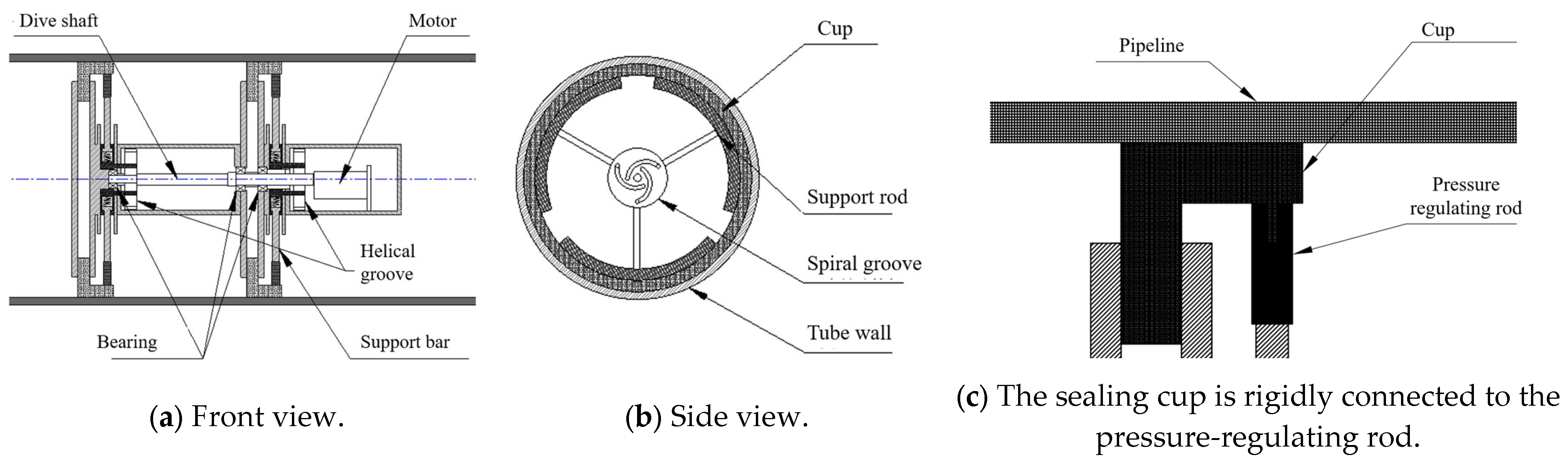 This paper proposed a mechanism capable of effectively regulating the frictional force between the cup seal and the pipeline inner wall, enabling both enhancement and reduction in the frictional force. As shown in Figure 7, spiral groove mechanism is designed, consisting of a spiral groove, a motor, and a pressure-regulating rod. The motor drives the spiral groove to rotate, thereby actuating the vertical movement of the transmission rod. The top of each transmission rod is equipped with a 90° arc-shaped end piece, which is fixedly connected to the cup seal. When the transmission rod moves upward, it compresses the cup seal to increase the frictional force; conversely, when the transmission rod moves downward, it pulls the cup seal to decrease the frictional force. The transmission rod is buffered by a spring to mitigate the impact force exerted on the pipeline. Compared with cam mechanisms, this mechanism features a relatively complex structure with more components. However, it offers notable advantages: the transmission rod allows for easy adjustment with a small rotation range. Furthermore, in contrast to cam mechanisms, the spiral groove mechanism can pull the cup seal toward the axis center, significantly improving the anti-jamming performance of the robot and preventing the robot from becoming stuck when passing through deformed pipeline sections. The design objective for the variable friction device is to provide a controllable friction adjustment range, one sufficient to overcome static jamming forces while simultaneously minimizing additional energy consumption and sealing cup wear.