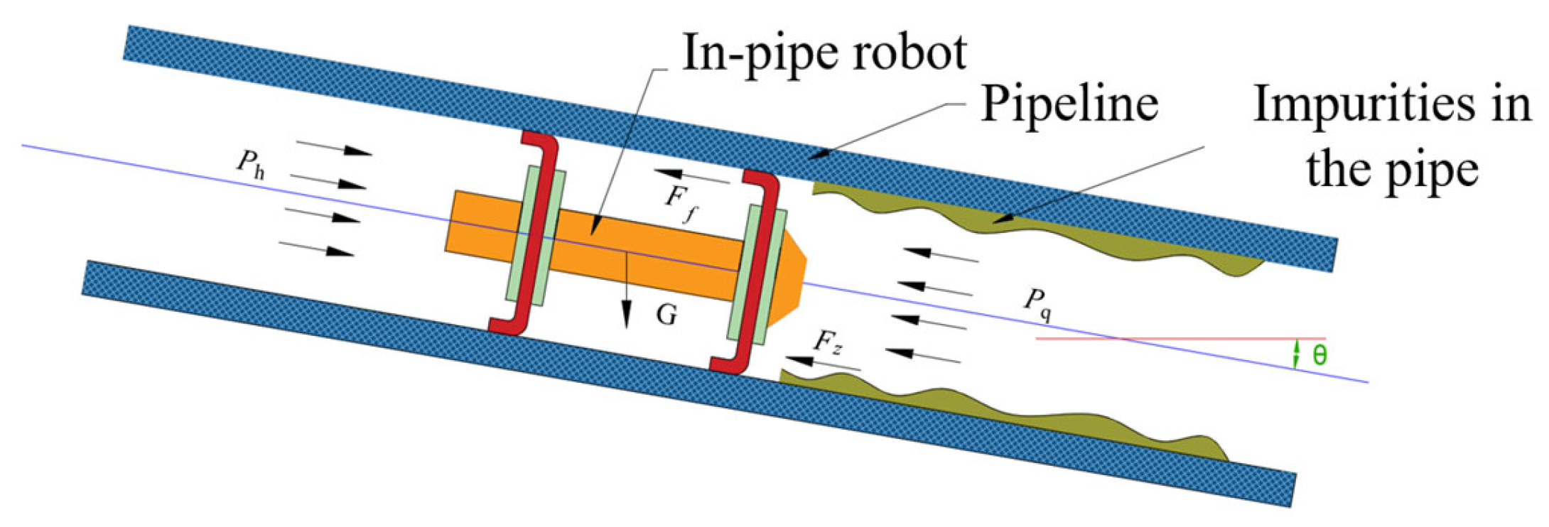 The robot experiences two primary driving forces during pipeline traversal: the gravitational driving force in downward pipe segments, and the propulsion force F d generated by the fluid pressure differential across the robot, with the latter being the dominant driving force.