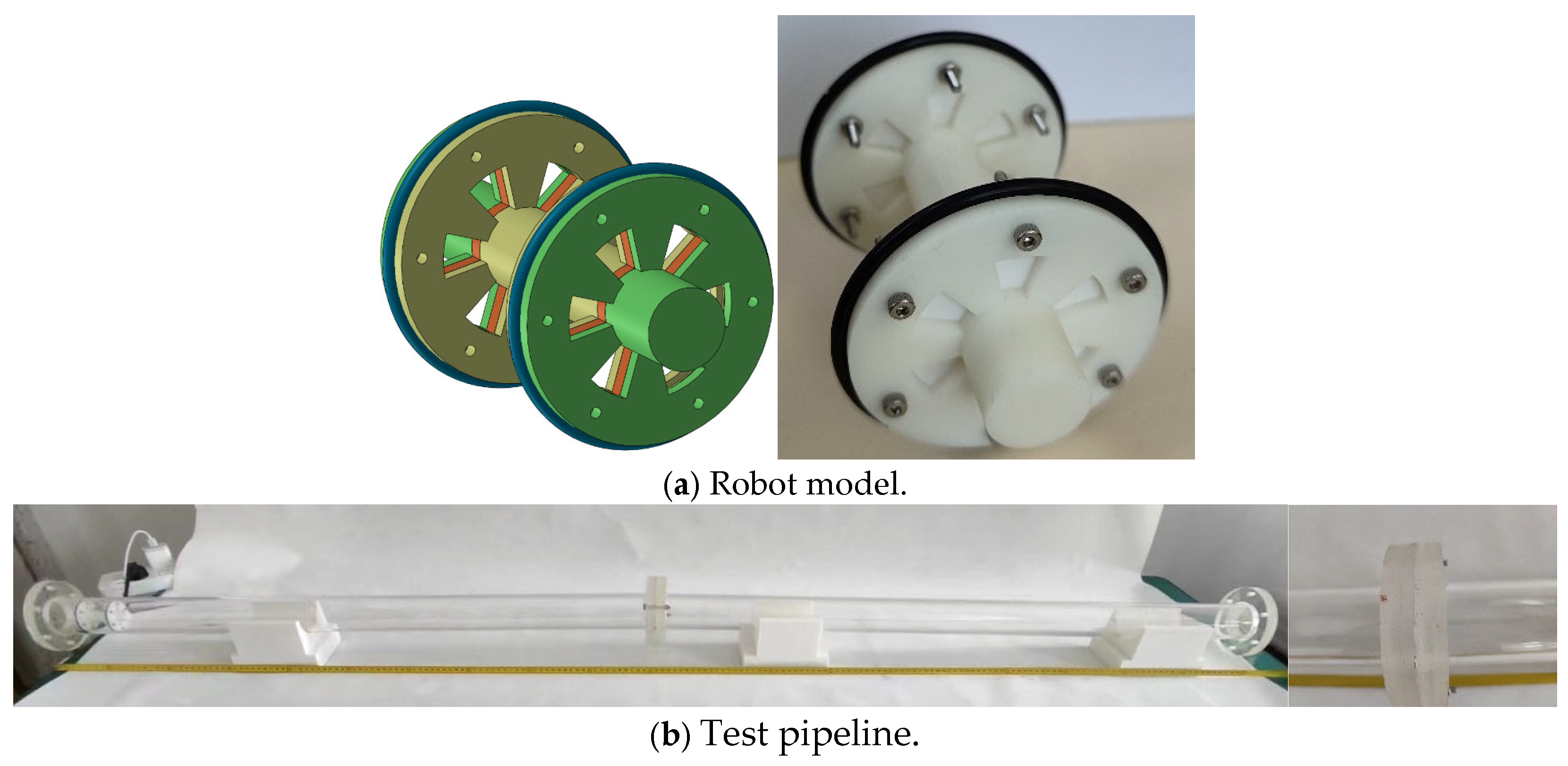 Research on pipeline inspection robots can be traced back to the 1970s. British Gas pioneered the field with its pipeline inspection gauge (PIG), which utilized fluid propulsion combined with ultrasonic or magnetic flux leakage (MFL) technology, capable of identifying pipeline corrosion defects with an accuracy of ±1 mm [1]. To address the issues of poor pipeline diameter adaptability and low detection efficiency in existing pipeline inspection robots, Wang et al. [2] proposed a multi-link elastic telescoping variable-diameter pipeline inspection robot. Driven by a single motor via a screw mechanism, this robot achieves self-adaptation to diameters ranging from 332 to 438 mm while significantly reducing weight. Tang et al. [3] proposed an intelligent material-driven pipeline inspection robot scheme for complex pipeline systems. Utilizing magnet assemblies for adaptability to different pipes, it solved the problem of rapid movement in sub-centimeter and various pipelines. Li et al. [4] presented a novel mobile robot scheme for the periodic inspection of oil pipelines, addressing challenges such as traction, obstacle crossing, endurance, slope climbing, visual perception, and stability in harsh environments. Kakogawa et al. [5] proposed a multi-link articulated robot with omnidirectional wheels and hemispherical wheels (AIRo-2.1); this pipeline robot achieves body bending solely using torsion springs, exhibiting high mobility. Guo et al. [6] developed a six-legged pipeline robot scheme with load-bearing capacity and a micro-defect segmenter for precise inner surface defect detection in pipelines, achieving a micro-defect detection accuracy of 95.67%. Yin et al. [7] proposed a novel screw-driven pipeline inspection robot (IPIR) that adapts to pipeline inner diameter changes using biomimetic principles and the deformation characteristics of flexible components; it also enables wireless transmission of pipeline inner wall image data. Elankavi et al. [8], highlighting the limitations of traditional manual inspection and early robot designs, proposed two wheeled pipeline inspection robot schemes (Kuzhali I and Kuzhali II), both capable of overcoming motion singularities in curved pipes, with experimental and simulation errors below 5%. Ma et al. [9] investigated vibration and damage issues during underwater launcher deployment of pipeline inspection gauges (PIGs), finding that the average PIG speed is positively correlated with inlet flow velocity, while factors like friction, inclination angle, and offset distance influence its motion. Venkateswaran et al. [10] developed a rigid tracked inspection robot, introducing a tensioning mechanism with three tension springs and a passive universal joint between each module. By considering cable pre-tension, optimal parameters for the robot assembly were determined, ensuring overall stability.