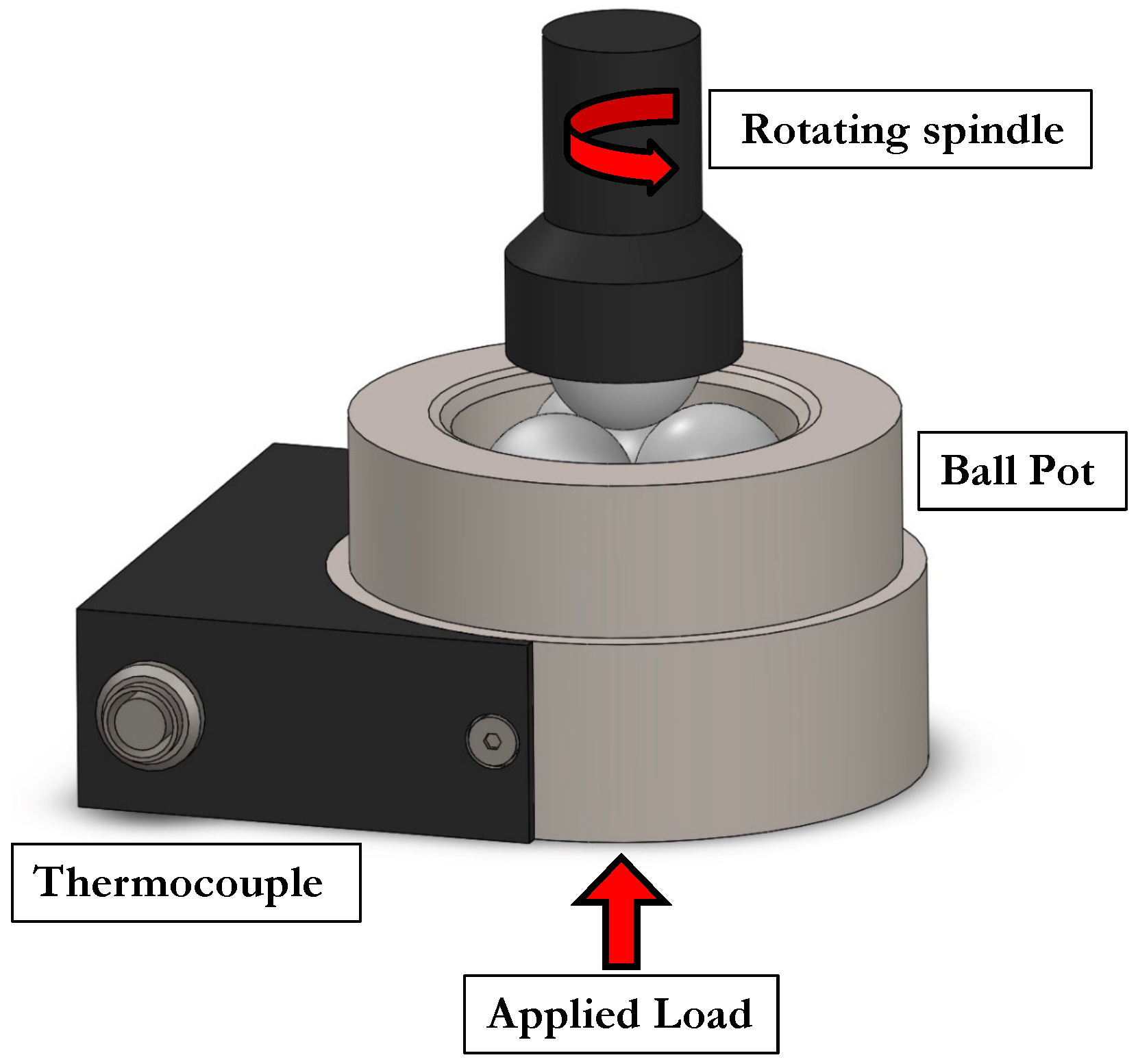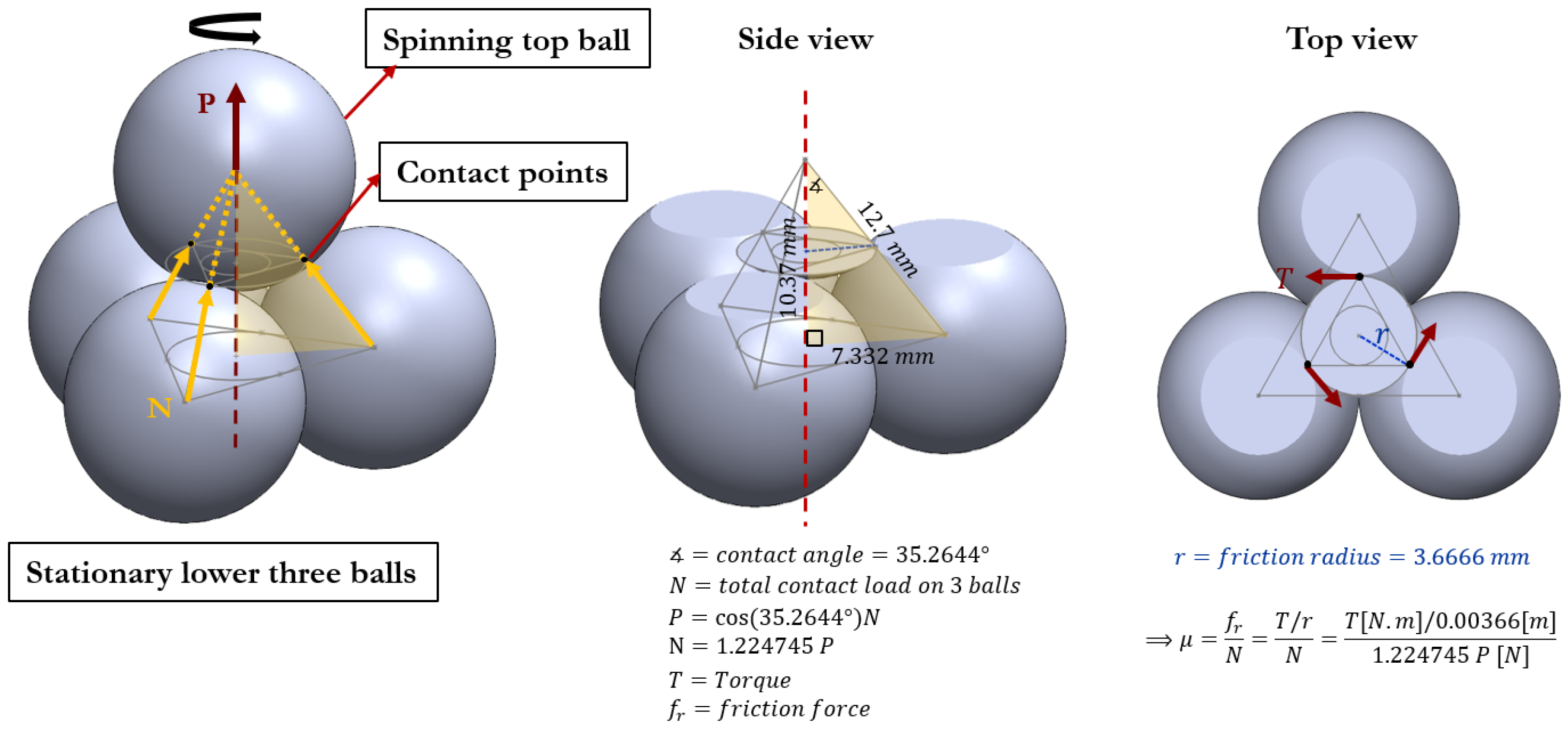2]. In this configuration, three stationary balls are rigidly clamped in a triangular formation, while a fourth (upper) ball is pressed against them and rotated under a prescribed speed and load (See