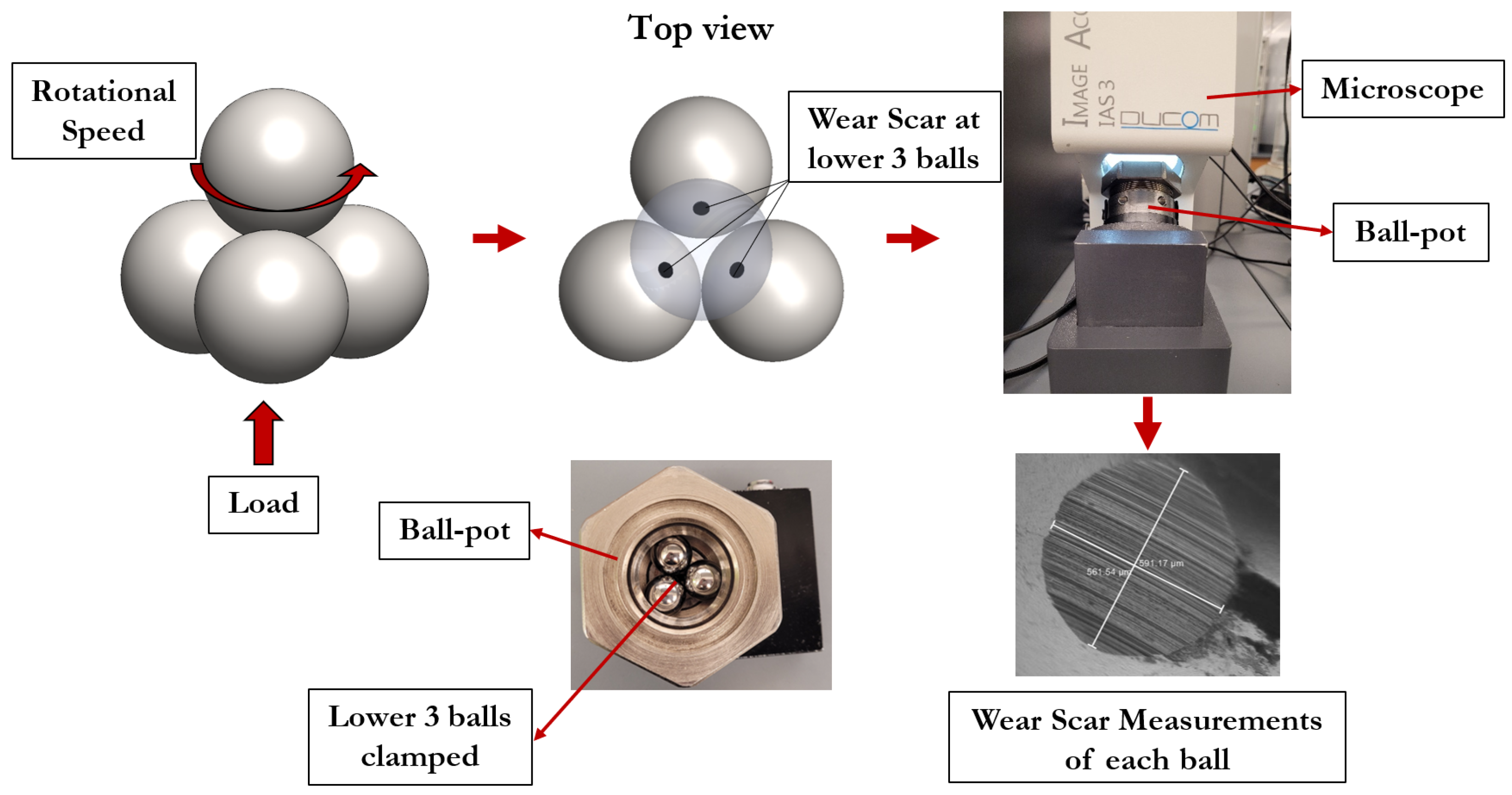 19]. Upon completion of each 60 min test, the three stationary lower balls were removed as a clamped assembly and examined using a calibrated optical microscope with a resolution of 0.01 µm. The overall procedure for wear assessment is illustrated schematically in