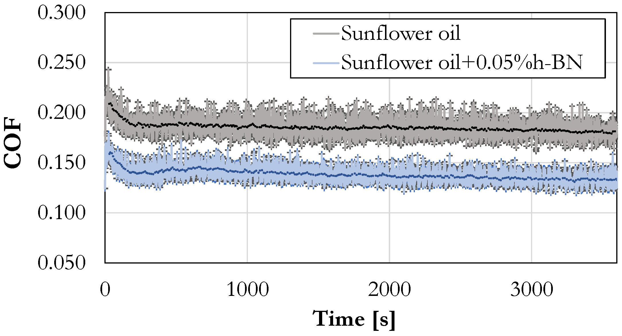 Evolution of the coefficient of friction over time for base sunflower oil and sunflower oil with 0.05 wt% h-BN additive, obtained from four-ball tester experiments.