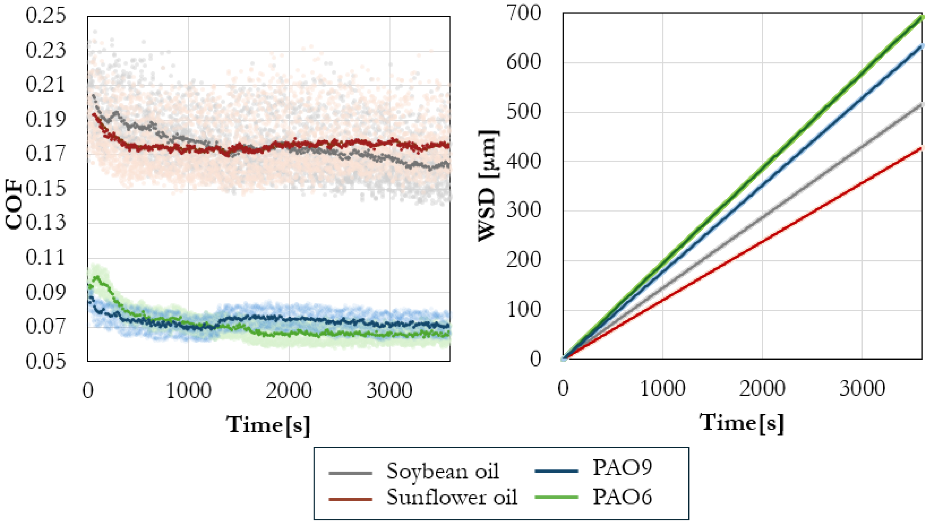 Figure 5 presents the evolution of the coefficient of friction (COF) and wear scar diameter (WSD) over time for four base lubricants: soybean oil, sunflower oil, PAO6, and PAO9. This example illustrates how the tribological response—both friction and wear—varies as a function of the selected base oil. As expected, the vegetable oils exhibit greater variability in friction compared to the synthetic PAOs, consistent with differences in viscosity–temperature behavior, polarity, and boundary lubrication properties [