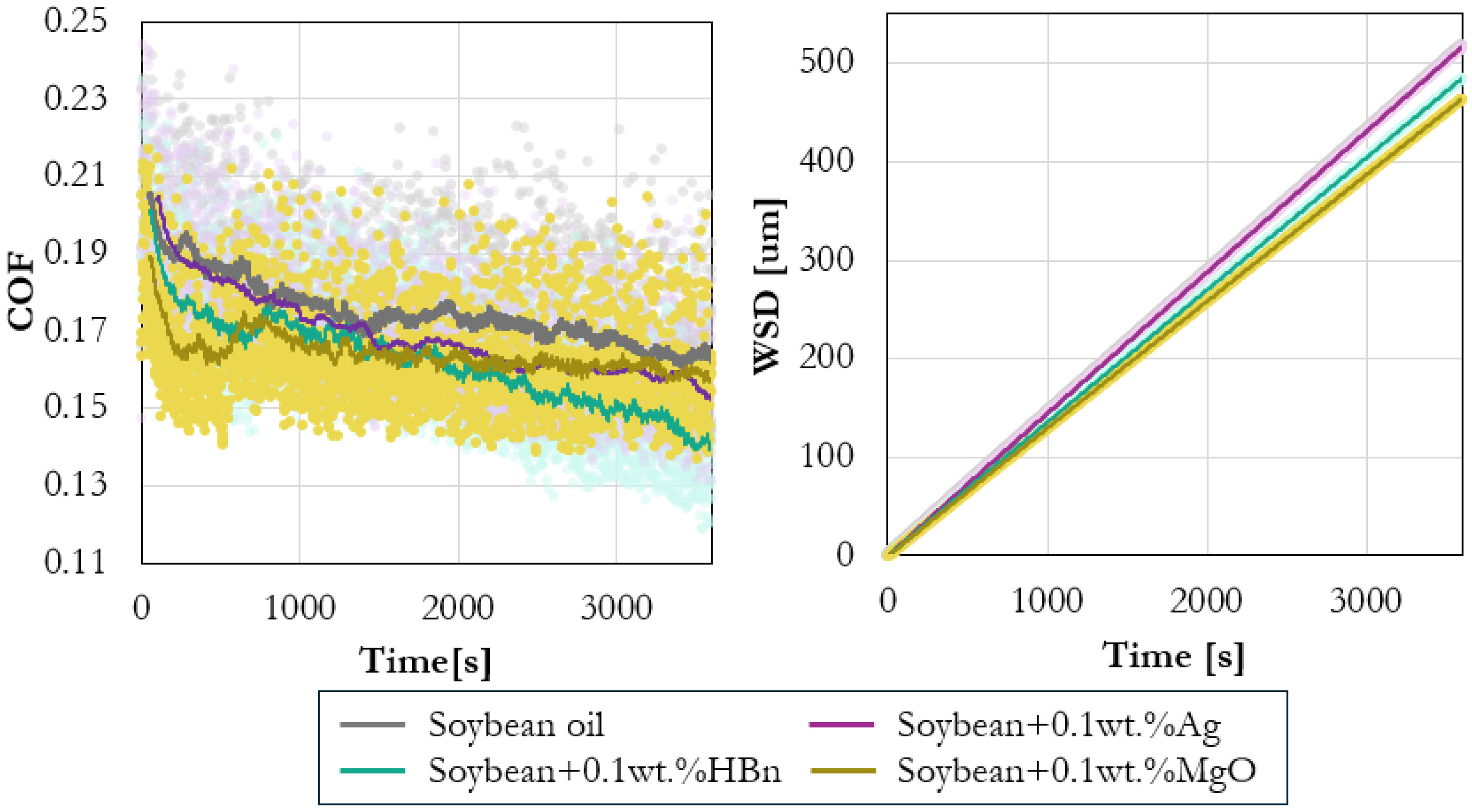 Figure 6 compares the tribological behavior of soybean oil containing 0.1 wt% of silver (Ag), hexagonal boron nitride (h-BN), or magnesium oxide (MgO) nanoparticles. While the effect is less pronounced than the differences observed between base oils, clear variations can still be seen in the evolution of COF and WSD depending on the additive employed. These differences are consistent with the distinct lubrication mechanisms typically associated with each additive—Ag as a surface-active modifier, h-BN as a lamellar solid lubricant, and MgO as an oxide-based stabilizer [