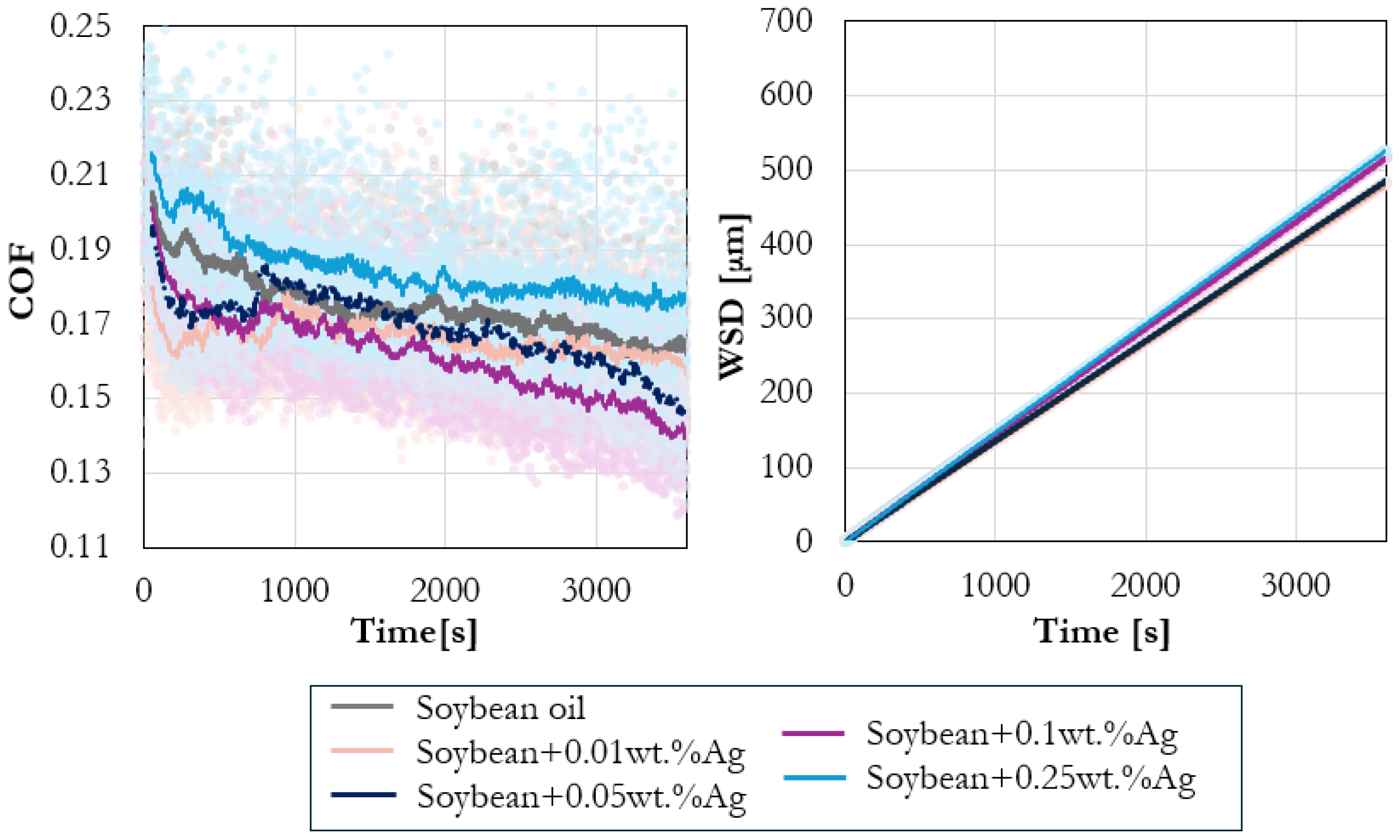 Representative evolution of COF and WSD in soybean oil containing silver nanoparticles (Ag) at different concentrations (0.01, 0.05, 0.10, and 0.25 wt%). Results highlight the non-monotonic dependence of tribological performance on additive loading. Dots show raw data; solid lines indicate moving-average trends.