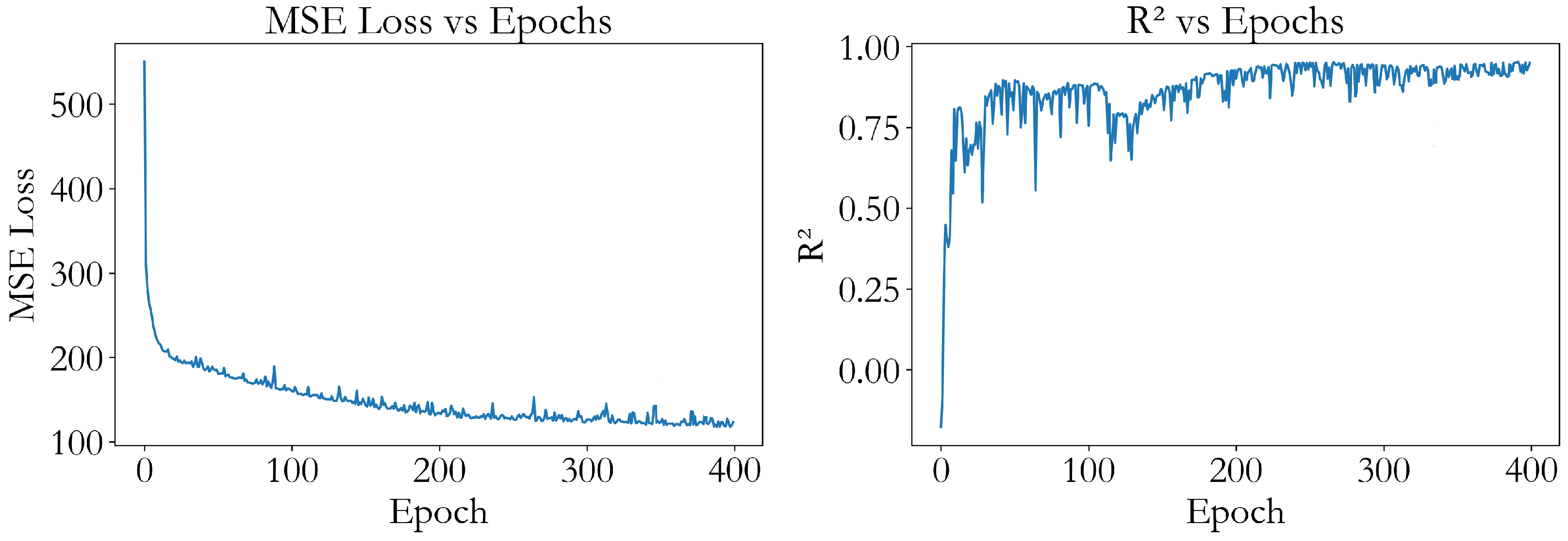 Evolution of the training loss (MSE) and coefficient of determination (R2) across training epochs, illustrating the convergence behavior of the neural network.