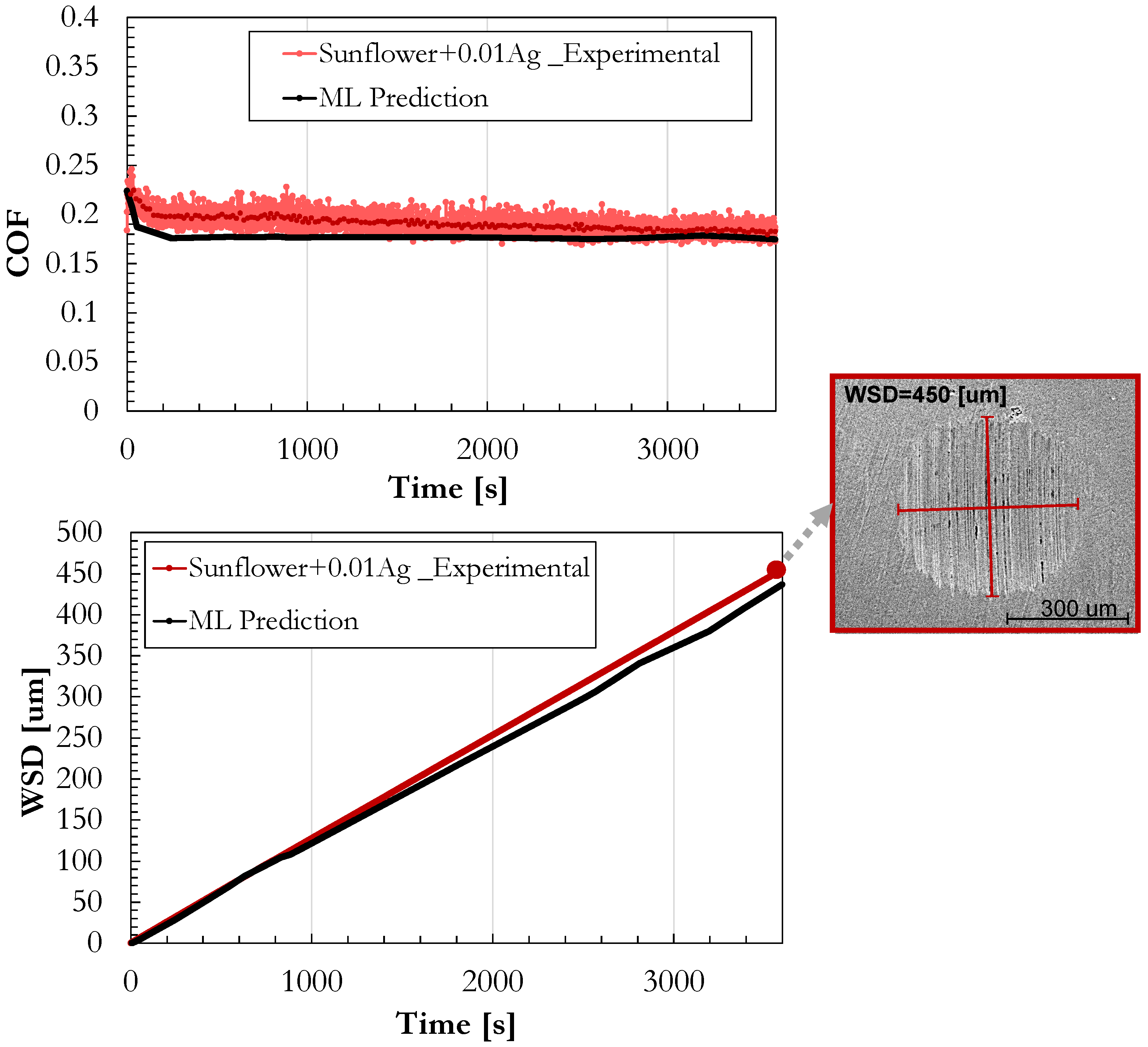 Comparison of experimental COF and WSD progression over time with model predictions for Sunflower oil with 0.01 wt% Ag.