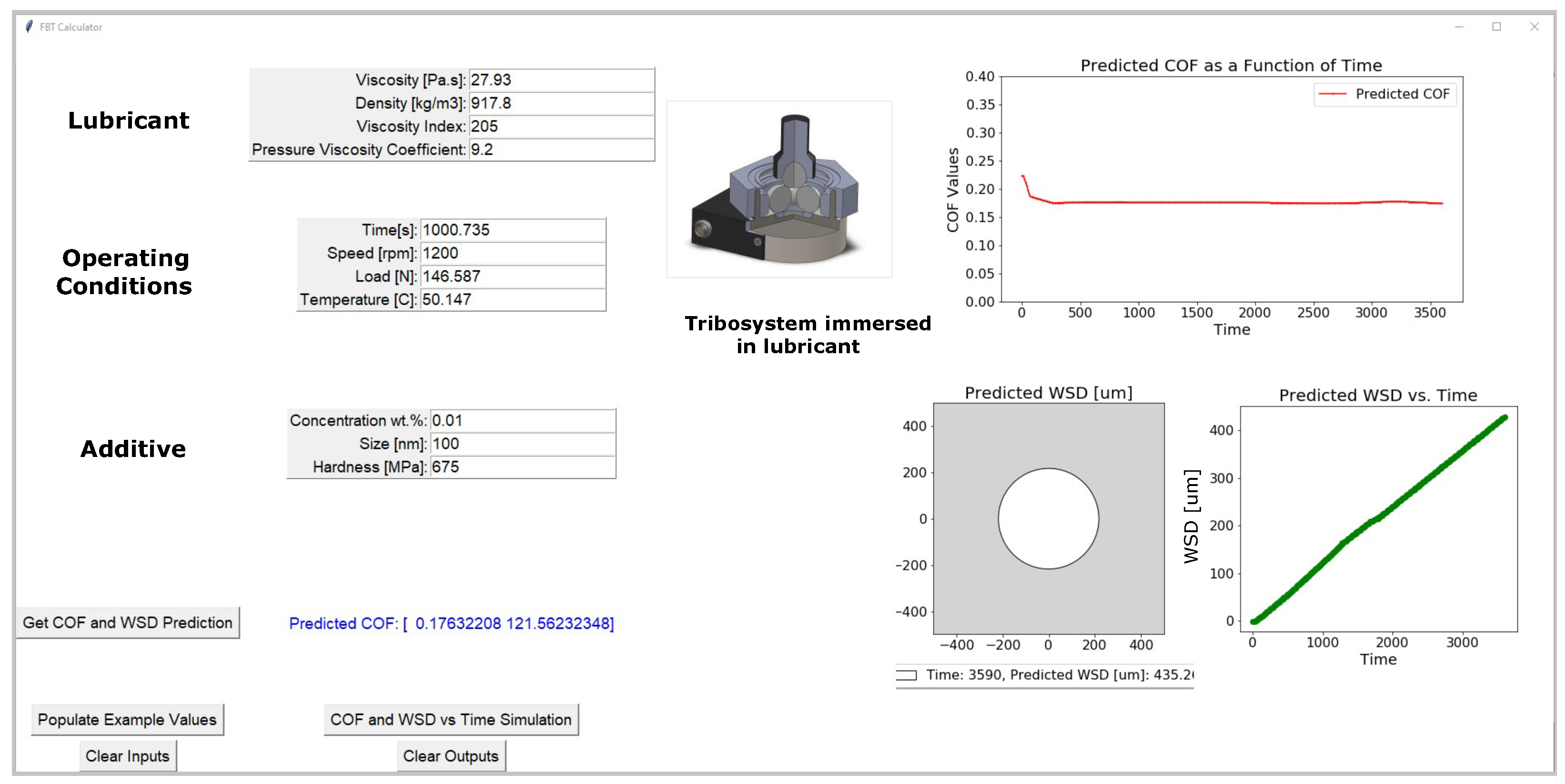 Example of GUI output showing predicted COF and WSD evolution over time for user-specified inputs.
